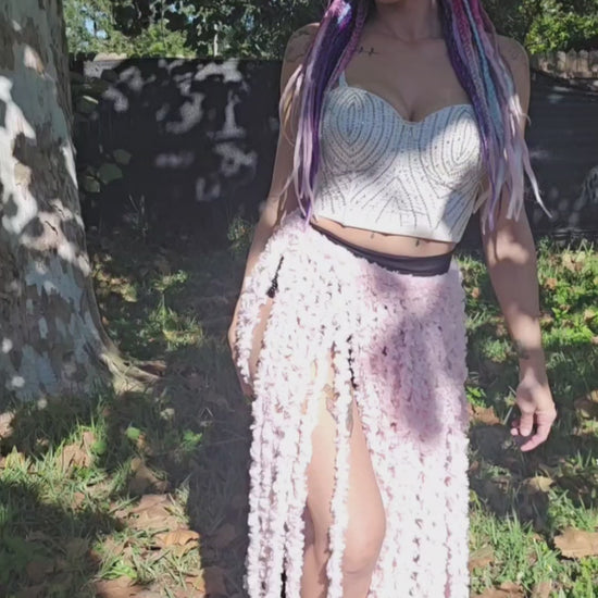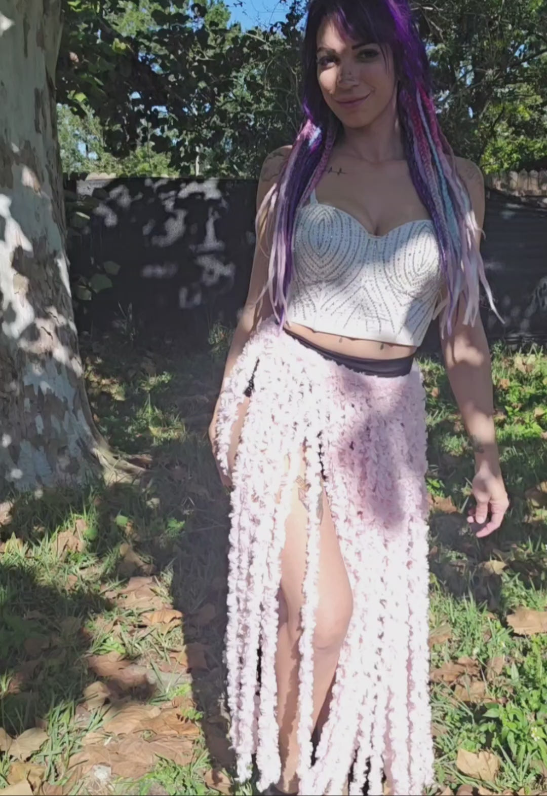 Super soft, fuzzy, light pink faux fur creates a cozy wraparound skirt that is both comfortable and beautiful. Great for strolling the beach this fall.
