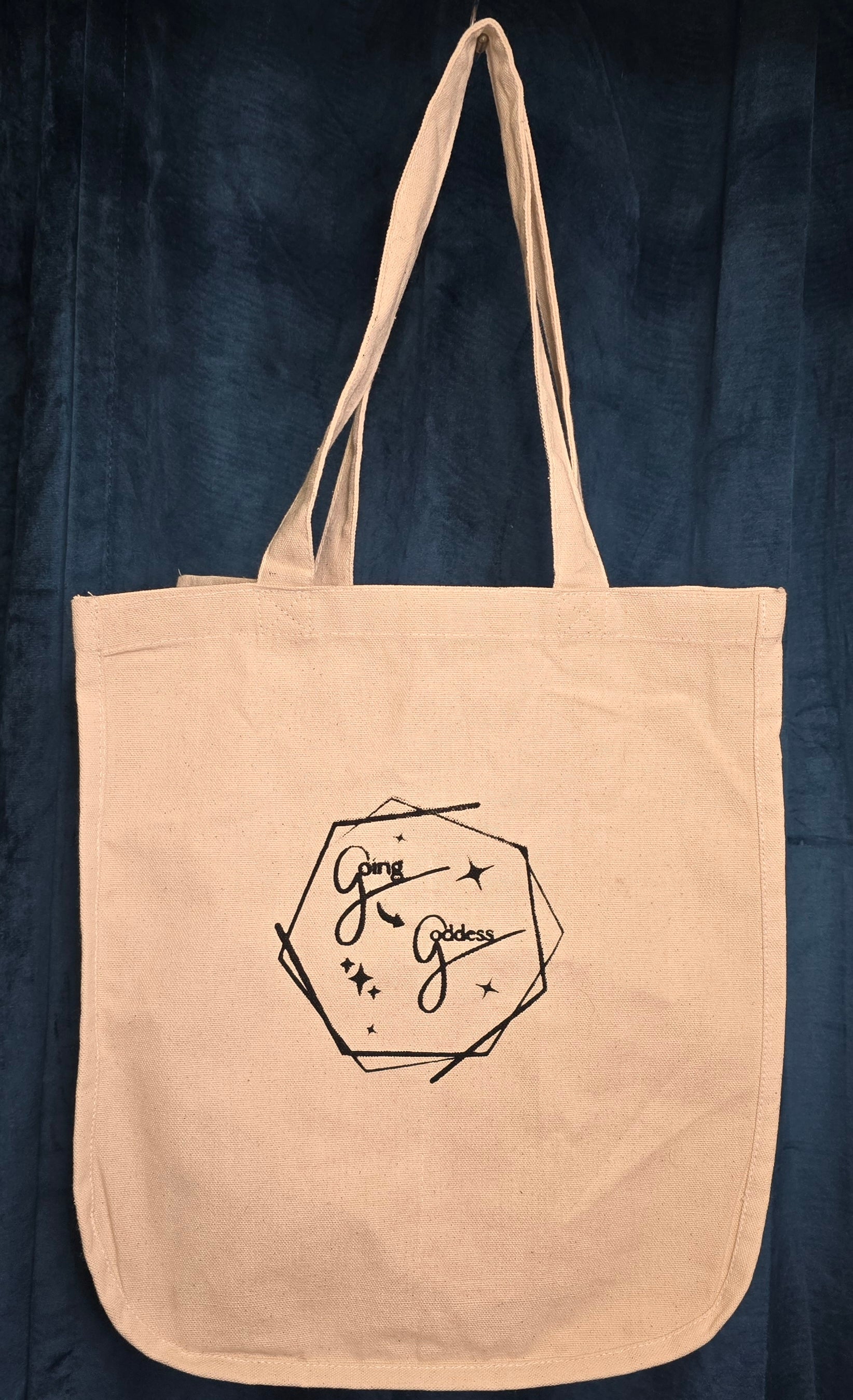 Custom Going Goddess utility tote bag with multiple pockets inside.